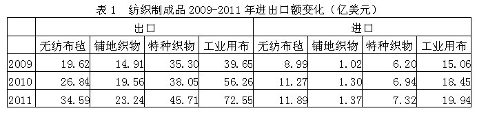 我國紡織制成品無紡布氈出口額從2009年19.62億美元改變至2011年34.59億美元,增加76.27%;鋪地織物出口額從14.91億美元改變至23.24億美元,增加55.82%;特種織物出口額從35.30億美元改變至45.71億美元,增加29.50%;工業(yè)用布出口額從39.65億美元改變至72.55億美元,增加82.97%;在進口方面,無紡布氈進口額從8.99億美元改變至11.89億美元,增加32.25%;鋪地織物進口額從1.02億美元改變至1.37億美元,增加34.13%;特種織物進口額從6.20億美元改變至7.32億美元,增加18.06%;工業(yè)用布進口額從15.06億美元改變至19.94億美元,增加32.41%;顯示紡織制成品出口遠高于進口,順差明顯,表明我國紡織制成品在國際市場上競爭力較強。