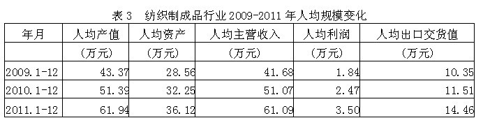 從行業(yè)人均規(guī)模的變化情況看,紡織制成品行業(yè)人均產值從2009年的43.37萬元改變至2011年的61.94萬元,增加42.80%;行業(yè)人均資產從28.56萬元改變至36.12萬元,增加26.45%;行業(yè)人均主營收入從41.68萬元改變至61.09萬元,增加46.57%;行業(yè)人均利潤從1.84萬元改變至3.50萬元,增加90.32%;行業(yè)人均出口交貨值從10.35萬元改變至14.46萬元,增加39.68%。由此可見,紡織制成品行業(yè)在近幾年的發(fā)展過程中,行業(yè)人均規(guī)模發(fā)生了積極的變化,反映企業(yè)勞動生產率和企業(yè)的綜合競爭力較好。