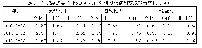 從短期償債和變現(xiàn)能力變化情況看,紡織制成品全行業(yè)流動比率(流動資產/流動負債)從2009年2.39倍改變至2011年2.66倍,其中國有企業(yè)從1.65倍改變至1.83倍,非國有企業(yè)從2.44倍改變至2.72倍,流動比率較高,表明企業(yè)短期償債能力較強;