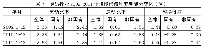 從速動比率((流動資產(chǎn)-存貨)/流動負債)變化情況看,麻紡全行業(yè)從2009年1.32倍改變至2011年1.42倍,其中國有企業(yè)從0.60倍改變至0.57倍;非國有企業(yè)從1.50倍改變至1.63倍,速動比率較高,表明在不考慮存貨的情況下,企業(yè)流動資產(chǎn)的變現(xiàn)能力較強;