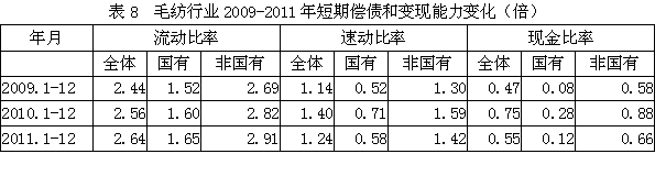 從短期償債和變現(xiàn)能力變化情況看,毛紡全行業(yè)流動(dòng)比率(流動(dòng)資產(chǎn)/流動(dòng)負(fù)債)從2009年2.44倍改變至2011年2.64倍,其中國(guó)有企業(yè)從1.52倍改變至1.65倍,非國(guó)有企業(yè)從2.69倍改變至2.91倍,流動(dòng)比率較高,表明企業(yè)短期償債能力較強(qiáng);