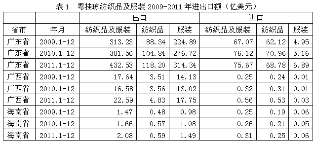 我國(guó)廣東紡織品及服裝出口額從2009年313.23億美元改變至2011年432.53億美元,增加38.09%;其中紡織品出口額從88.34億美元改變至118.20億美元,增加33.79%;服裝出口額從224.89億美元改變至314.34億美元,增加39.77%;在進(jìn)口方面,廣東紡織品及服裝進(jìn)口額從67.07億美元改變至75.67億美元,增加12.83%;其中紡織品進(jìn)口額從62.12億美元改變至68.78億美元,增加10.73%;服裝進(jìn)口額從4.95億美元改變至6.89億美元,增加39.13%。此外,廣西、海南紡織品及服裝進(jìn)出口額均有所變化,由此可見(jiàn),粵桂瓊地區(qū)紡織品服裝出口高于進(jìn)口,順差明顯,表明該地區(qū)紡織品服裝在國(guó)際市場(chǎng)上競(jìng)爭(zhēng)力較強(qiáng)。