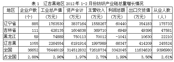 據(jù)國家統(tǒng)計局公布的數(shù)據(jù),2012年1-2月份我國遼吉黑三省(遼寧省、吉林省、黑龍江)紡織產(chǎn)業(yè)鏈(從紡織上游原料到下游服裝)規(guī)模以上企業(yè)數(shù)量為1055家,占全國總數(shù)的2.88%;工業(yè)總產(chǎn)值為226.46億元,占2.96%;資產(chǎn)合計為619.19億元,占1.97%;主營收入為199.80億元,占2.75%;利潤總額為6.63億元,占1.99%;出口交貨值為41.42億元,占3.56%;從業(yè)人數(shù)為24.55萬人,占2.61%。由此可見,遼吉黑地區(qū)紡織產(chǎn)業(yè)鏈總產(chǎn)值、總資產(chǎn)、主營收入、出口和就業(yè)均給全國作出了一定的貢獻(xiàn)。