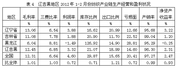 從生產(chǎn)經(jīng)營和盈利狀況看,遼吉黑紡織產(chǎn)業(yè)鏈毛利率2012年1-2月份為12.45%,為全國平均數(shù)的1.01倍,三費比率(營業(yè)、管理和財務(wù)費用率之和)為6.85%,為全國平均數(shù)的1.03倍,利潤率為3.32%,為全國平均數(shù)的0.72倍;庫存比率為21.07%,為全國平均數(shù)的0.71倍;出口比例為18.99%,為全國平均數(shù)的1.21倍;企業(yè)虧損面為14.60%,為全國平均數(shù)的0.72倍。由此可見,遼吉黑地區(qū)的盈利狀況接近于全國紡織產(chǎn)業(yè)鏈的平均水平。