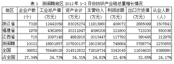 據(jù)國家統(tǒng)計局公布的數(shù)據(jù),2012年1-2月份我國浙閩贛三?。ㄕ憬?、福建省、江西省)紡織產(chǎn)業(yè)鏈(從紡織上游原料到下游服裝)規(guī)模以上企業(yè)數(shù)量為10022家,占全國總數(shù)的27.34%;工業(yè)總產(chǎn)值為1890.19億元,占24.73%;資產(chǎn)合計為10792.01億元,占34.31%;主營收入為1802.36億元,占24.82%;利潤總額為74.87億元,占22.40%;出口交貨值為379.88億元,占32.65%;從業(yè)人數(shù)為227.09萬人,占24.17%。由此可見,浙閩贛地區(qū)紡織產(chǎn)業(yè)鏈總產(chǎn)值、總資產(chǎn)、主營收入、利潤總額、出口和就業(yè)均給全國作出了巨大的貢獻。