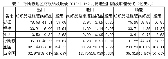 我國浙閩贛三省2012年1-2月份紡織品及服裝出口額為106.00億美元,占全國紡織品服裝出口總額的32.97%,其中紡織品出口額為48.33億美元,占全國38.01%,服裝出口額為57.67億美元,占全國29.67%;在進口方面,浙閩贛三省紡織品及服裝進口額為4.23億美元,占全國紡織品服裝進口總額的12.70%,其中紡織品進口額為3.91億美元,占全國15.02%,服裝進口額為0.31億美元,占全國4.36%;顯示我國浙閩贛地區(qū)紡織品服裝出口總額遠高于進口總額,順差明顯,表明該地區(qū)紡織品服裝在國際市場上競爭力較強。
