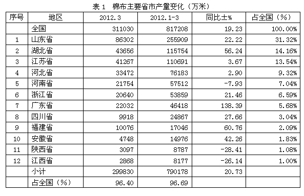 全國棉布2012年1-3月份產(chǎn)量合計為81.72億米,比上年同期增加19.23%;其中產(chǎn)量最大的省市是山東省,產(chǎn)量為25.59億米,為省市龍頭;其次是湖北省,產(chǎn)量11.58億米,位居亞軍;然后是江蘇省,產(chǎn)量11.07億米,榮立第三;河北省7.62億米,為第四;河南省5.75億米,占第五;浙江省5.39億米,位居第六;接下來是廣東省4.64億米,為第七;四川省2.49億米,占第八;福建省1.70億米,位居第九;安徽省1.50億米,為第十名;陜西省0.88億米,居第11名;江西省0.82億米,榮立第12名。上述12大省市2012年1-3月份產(chǎn)量合計為79.02億米,占全國2012年1-3月份總產(chǎn)量的96.69%。