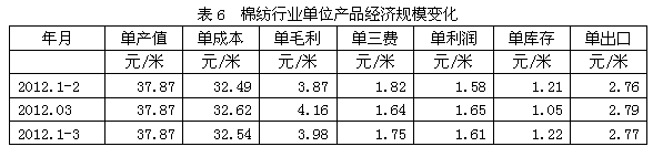 從單位產(chǎn)品經(jīng)濟規(guī)模變化情況看,2012年1-3月份我國棉紡織行業(yè)中相對于每米棉布產(chǎn)量而言,其單產(chǎn)值為37.87元/米,單成本為32.54元/米,單毛利為3.98元/米,單三費為1.75元/米,單利潤為1.61元/米,單庫存為1.22元/米,單出口為2.77元/米。由此看來,假如把單產(chǎn)值近似看成每米棉布產(chǎn)量的行業(yè)平均參考價格,那么其單成本約占85.93%,單毛利約占10.52%,單三費約占4.62%,單利潤約占4.24%,單庫存約占3.21%,單出口約占7.32%。