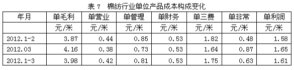 從單位產(chǎn)品成本構(gòu)成變化情況看,2012年1-3月份我國棉紡織行業(yè)中相對于每米棉布產(chǎn)量而言,其單毛利為3.98元/米,單營業(yè)(單位產(chǎn)品的營業(yè)費用)為0.42元/米,單管理(單位產(chǎn)品的管理費用)為0.81元/米,單財務(wù)(單位產(chǎn)品的財務(wù)費用)為0.53元/米,單三費為1.75元/米,單非常(單位產(chǎn)品的非經(jīng)常性損益)為0.63元/米,單利潤(稅前利潤)為1.61元/米,如果剔除非經(jīng)常性損益的影響,單位產(chǎn)品的名義稅前利潤為2.23元/米。