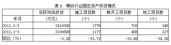 據(jù)國家統(tǒng)計局公布的數(shù)據(jù),2012年1-3月份棉紡行業(yè)實際完成投資額233.07億元,同比減少3.29%;當(dāng)年以來到目前為止施工項目總數(shù)為1177個,同比減少33.73%;其中新開工項目數(shù)468個,同比減少33.99%;截至3月底為止,已實現(xiàn)竣工項目數(shù)227個,同比減少34.39%,占施工項目總數(shù)的19.29%,表明該行業(yè)投資項目進展較好。