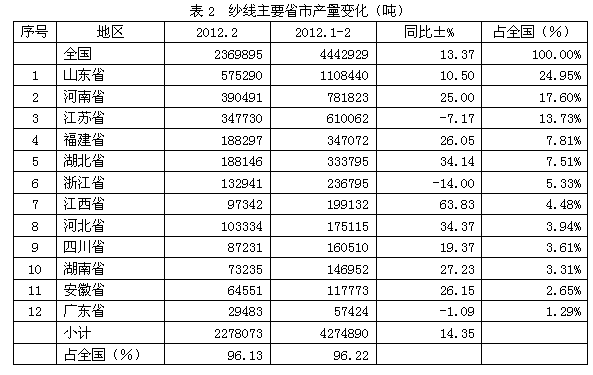 全國(guó)紗2012年1-2月份產(chǎn)量合計(jì)為444.29萬噸,比上年同期增加13.37%;其中產(chǎn)量最大的省市是山東省,產(chǎn)量為110.84萬噸,為省市龍頭;其次是河南省,產(chǎn)量78.18萬噸,位居亞軍;然后是江蘇省,產(chǎn)量61.01萬噸,榮立第三;福建省34.71萬噸,為第四;湖北省33.38萬噸,占第五;浙江省23.68萬噸,位居第六;接下來是江西省19.91萬噸,為第七;河北省17.51萬噸,占第八;四川省16.05萬噸,位居第九;湖南省14.70萬噸,為第十名;安徽省11.78萬噸,居第11名;廣東省5.74萬噸,榮立第12名。上述12大省市2012年1-2月份產(chǎn)量合計(jì)為427.49萬噸,占全國(guó)2012年1-2月份總產(chǎn)量的96.22%。