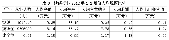 從行業(yè)人均規(guī)模的變化情況看,2012年1-2月份紗線行業(yè)人均產(chǎn)值為9.38萬元,為紡織全行業(yè)平均數(shù)的1.15倍;人均資產(chǎn)為33.19萬元,為行業(yè)平均數(shù)的0.99倍;人均主營(yíng)收入為9.06萬元,為行業(yè)平均數(shù)的1.17倍;人均利潤(rùn)為0.42萬元,為行業(yè)平均數(shù)的1.18倍;人均出口交貨值為0.41萬元,為行業(yè)平均數(shù)的0.33倍。由此可見,紗線行業(yè)的人均規(guī)模接近于紡織全行業(yè)的平均數(shù),反映該行業(yè)勞動(dòng)生產(chǎn)率和綜合競(jìng)爭(zhēng)力相當(dāng)于全行業(yè)的平均水平,對(duì)全行業(yè)的貢獻(xiàn)比較可觀。