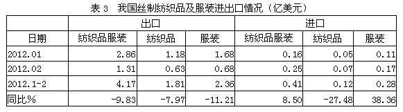 根據(jù)中國海關(guān)的統(tǒng)計(jì)數(shù)據(jù),我國2012年1-2月份絲制紡織品及服裝出口總額4.17億美元,同比減少9.83%,占紡織品及服裝出口總額321.49億美元的1.30%;其中1-2月份絲制紡織品出口總額1.81億美元,同比減少7.97%,占紡織品出口總額127.16億美元的1.42%;1-2月份絲制服裝出口總額2.36億美元,同比減少11.21%,占服裝出口總額194.33億美元的1.21%;