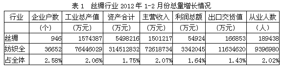 據(jù)國家統(tǒng)計(jì)局公布的數(shù)據(jù)(按往年慣例,1-2月份的經(jīng)濟(jì)指標(biāo)數(shù)據(jù)合并在一起),2012年1-2月份我國規(guī)模以上(自2011年起,規(guī)模以上企業(yè)劃分標(biāo)準(zhǔn)調(diào)整為年主營業(yè)務(wù)收入2000萬元及以上工業(yè)法人企業(yè))絲絹紡織行業(yè)企業(yè)數(shù)量為946家,占紡織全行業(yè)的2.58%;工業(yè)總產(chǎn)值為157.44億元,占2.06%;資產(chǎn)合計(jì)為549.82億元,占1.75%;主營收入為150.12億元,占2.07%;利潤總額為5.49億元,占1.64%;出口交貨值為16.69億元,占1.43%;從業(yè)人數(shù)為18.94萬人,占2.02%。由此可見,絲絹紡織行業(yè)總產(chǎn)值、總資產(chǎn)、主營收入、利潤總額、出口和就業(yè)均給紡織全行業(yè)作出了一定的貢獻(xiàn)。