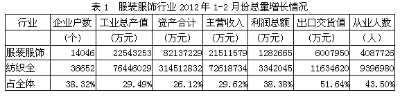 據(jù)國家統(tǒng)計局公布的數(shù)據(jù)(按往年慣例,1-2月份的經(jīng)濟(jì)指標(biāo)數(shù)據(jù)合并在一起),2012年1-2月份我國規(guī)模以上(自2011年起,規(guī)模以上企業(yè)劃分標(biāo)準(zhǔn)調(diào)整為年主營業(yè)務(wù)收入2000萬元及以上工業(yè)法人企業(yè))服裝服飾行業(yè)企業(yè)數(shù)量為14046家,占紡織全行業(yè)的38.32%;工業(yè)總產(chǎn)值為2254.33億元,占29.49%;資產(chǎn)合計為8213.72億元,占26.12%;主營收入為2151.16億元,占29.62%;利潤總額為128.27億元,占38.38%;出口交貨值為600.80億元,占51.64%;從業(yè)人數(shù)為408.77萬人,占43.50%。由此可見,服裝服飾行業(yè)總產(chǎn)值、總資產(chǎn)、主營收入、利潤總額、出口和就業(yè)均給紡織全行業(yè)作出了巨大的貢獻(xiàn)。