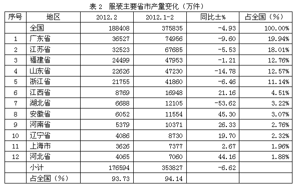 從2012年2月份的情況看,全國服裝當(dāng)月總產(chǎn)量為18.84億件,上述12大省市的當(dāng)月產(chǎn)量合計為17.66億件,占全國當(dāng)月總產(chǎn)量的93.73%;由此可見,我國前12大省市的服裝產(chǎn)量約占全國總產(chǎn)量的絕大部分。
