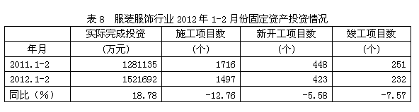 據(jù)國家統(tǒng)計局公布的數(shù)據(jù),2012年1-2月份服裝鞋帽行業(yè)實際完成投資額152.17億元,同比增加18.78%;當(dāng)年以來到目前為止施工項目總數(shù)為1497個,同比減少12.76%;其中新開工項目數(shù)423個,同比減少5.58%;截至2月底為止,已實現(xiàn)竣工項目數(shù)232個,同比減少7.57%,占施工項目總數(shù)的15.50%,表明該行業(yè)投資項目進(jìn)展較好。