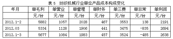 從單位產(chǎn)品成本構(gòu)成變化情況看,2012年1-3月份我國(guó)紡織機(jī)械行業(yè)中相對(duì)于每臺(tái)紡織機(jī)械產(chǎn)量而言,其單毛利為5677元/臺(tái),單營(yíng)業(yè)(單位產(chǎn)品的營(yíng)業(yè)費(fèi)用)為1084元/臺(tái),單管理(單位產(chǎn)品的管理費(fèi)用)為1983元/臺(tái),單財(cái)務(wù)(單位產(chǎn)品的財(cái)務(wù)費(fèi)用)為457元/臺(tái),單三費(fèi)為3524元/臺(tái),單非常(單位產(chǎn)品的非經(jīng)常性損益)為-485元/臺(tái),單利潤(rùn)(稅前利潤(rùn))為2638元/臺(tái),如果剔除非經(jīng)常性損益的影響,單位產(chǎn)品的名義稅前利潤(rùn)為2153元/臺(tái)。
