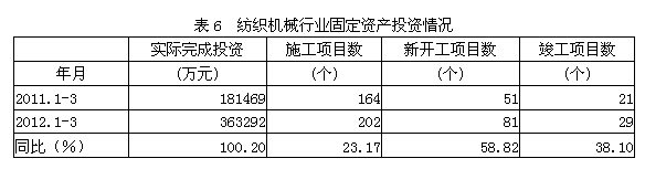 據(jù)國(guó)家統(tǒng)計(jì)局公布的數(shù)據(jù),2012年1-3月份紡織機(jī)械行業(yè)實(shí)際完成投資額36.33億元,同比增加100.20%;當(dāng)年以來到目前為止施工項(xiàng)目總數(shù)為202個(gè),同比增加23.17%;其中新開工項(xiàng)目數(shù)81個(gè),同比增加58.82%;截至3月底為止,已實(shí)現(xiàn)竣工項(xiàng)目數(shù)29個(gè),同比增加38.10%,占施工項(xiàng)目總數(shù)的14.36%,表明該行業(yè)投資項(xiàng)目進(jìn)展較好。