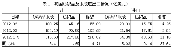 根據(jù)中國海關的統(tǒng)計數(shù)據(jù),我國2012年1-3月份紡織品及服裝出口總額515.68億美元,同比增加3.41%,占全國商品出口總額4300.20億美元的11.99%;其中1-3月份紡織品出口總額217.66億美元,同比增加1.69%,占紡織品及服裝出口總額515.68億美元的42.21%;1-3月份服裝出口總額298.02億美元,同比增加4.71%,占紡織品及服裝出口總額515.68億美元的57.79%;