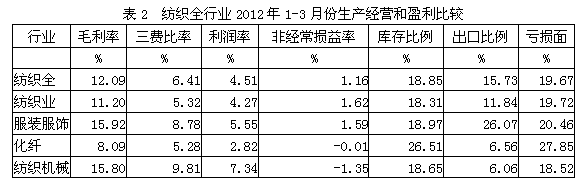 從企業(yè)生產(chǎn)經(jīng)營和盈利狀況看,紡織全行業(yè)毛利率2012年1-3月份為12.09%,三費比率(營業(yè)、管理和財務費用率之和)為6.41%,利潤率為4.51%,如果剔除非經(jīng)常性損益的影響,名義稅前利潤率為5.68%;該行業(yè)庫存比率為18.85%,表明產(chǎn)品銷售正常;出口比例為15.73%,表明出口狀況較好;該行業(yè)虧損面為19.67%。由此可見,在紡織全行業(yè)中,生產(chǎn)經(jīng)營狀況運作得較好。