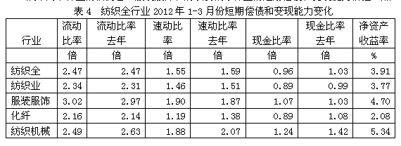 從短期償債和變現(xiàn)能力的變化看,紡織全行業(yè)流動比率(流動資產(chǎn)/流動負債)2012年1-3月份為2.47倍,而上年同期為2.47倍,流動比率較高,表明企業(yè)短期償債能力較強;
