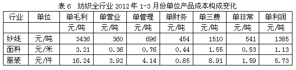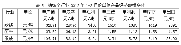 從單位產(chǎn)品成本構成變化情況看,2012年1-3月份我國紡織全行業(yè)中相對于每噸紗線產(chǎn)量而言,其單毛利為3436元/噸,單三費(單營業(yè)、單管理和單財務之和)為1510元/噸,單利潤(稅前利潤)為1385元/噸,如果剔除非經(jīng)常性損益的影響,單位產(chǎn)品的名義稅前利潤為1926元/噸;同樣,相對于每米面料產(chǎn)量而言,其單毛利為3.21元/米,單三費為1.55元/米,單利潤為1.13元/米,如果剔除非經(jīng)常性損益的影響,單位產(chǎn)品的名義稅前利潤為1.66元/米;此外,相對于每件機織服裝產(chǎn)量而言,其單毛利為16.24元/件,單三費為8.91元/件,單利潤為5.73元/件,如果剔除非經(jīng)常性損益的影響,單位產(chǎn)品的名義稅前利潤為7.32元/件。