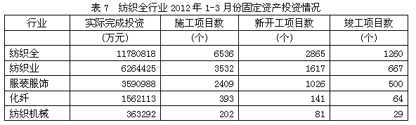 據(jù)國家統(tǒng)計局公布的數(shù)據(jù),2012年1-3月份紡織全行業(yè)實際完成投資額1178.08億元,同比增加17.00%;當年以來到目前為止施工項目總數(shù)為6536個,同比減少12.19%;其中新開工項目數(shù)2865個,同比減少6.65%;截至3月底為止,已實現(xiàn)竣工項目數(shù)1260個,同比減少14.29%,占施工項目總數(shù)的19.28%,表明該行業(yè)投資項目進展較好。