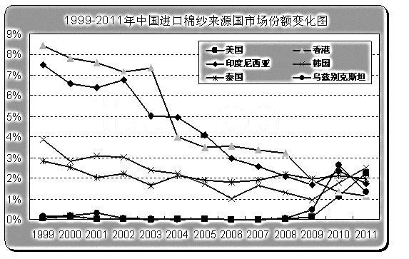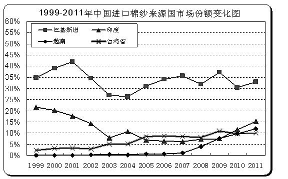 為了更清楚地了解我國進(jìn)口棉紗市場(chǎng)份額的變化,筆者整理了1999年~2011年中國進(jìn)口棉紗來源國的市場(chǎng)占比變化數(shù)據(jù)。從下圖可以看出,巴基斯坦和印度棉紗占我國市場(chǎng)的份額呈現(xiàn)明顯的階段性特征:從2004年開始,巴基斯坦在我國棉紗市場(chǎng)的占有率便呈現(xiàn)出逐步擴(kuò)大的趨勢(shì),雖局部有所調(diào)整,但整體格局依舊是向上的;而印度棉紗在我國的市場(chǎng)份額則從2005年開始逐步攀升,并近年來增速有明顯加快趨勢(shì);中國臺(tái)灣地區(qū)棉紗的市場(chǎng)份額則一直呈現(xiàn)遞增趨勢(shì),近年來略有調(diào)整,但向上的趨勢(shì)并未改變;越南棉紗在我國的市場(chǎng)占比則從2007年開始呈現(xiàn)快速增長態(tài)勢(shì)。
