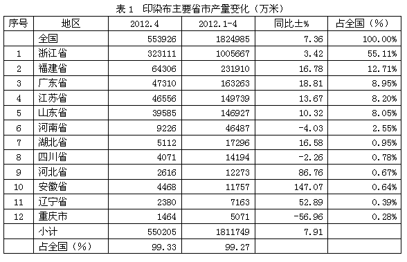 全國印染布2012年1-4月份產(chǎn)量合計為182.50億米,比上年同期增加7.36%;其中產(chǎn)量最大的省市是浙江省,產(chǎn)量為100.57億米,為省市龍頭;其次是福建省,產(chǎn)量23.19億米,位居亞軍;然后是廣東省,產(chǎn)量16.33億米,榮立第三;江蘇省14.97億米,為第四;山東省14.69億米,占第五;河南省4.65億米,位居第六;接下來是湖北省1.73億米,為第七;四川省1.42億米,占第八;河北省1.23億米,位居第九;安徽省1.18億米,為第十名;遼寧省0.72億米,居第11名;重慶市0.51億米,榮立第12名。上述12大省市2012年1-4月份產(chǎn)量合計為181.17億米,占全國2012年1-4月份總產(chǎn)量的99.27%。
