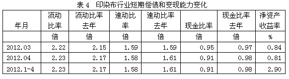 從短期償債和變現(xiàn)能力的變化看,印染布行業(yè)流動比率(流動資產(chǎn)/流動負債)2012年1-4月份為2.23倍,而上年同期為2.17倍,流動比率較高,表明企業(yè)短期償債能力較強;