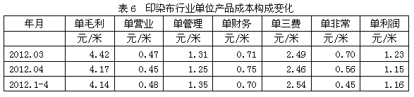 從單位產(chǎn)品成本構(gòu)成變化情況看,2012年1-4月份我國印染布行業(yè)中相對于每米印染布產(chǎn)量而言,其單毛利為4.14元/米,單營業(yè)(單位產(chǎn)品的營業(yè)費用)為0.48元/米,單管理(單位產(chǎn)品的管理費用)為1.35元/米,單財務(wù)(單位產(chǎn)品的財務(wù)費用)為0.70元/米,單三費為2.54元/米,單非常(單位產(chǎn)品的非經(jīng)常性損益)為0.45元/米,單利潤(稅前利潤)為1.16元/米,如果剔除非經(jīng)常性損益的影響,單位產(chǎn)品的名義稅前利潤為1.61元/米。