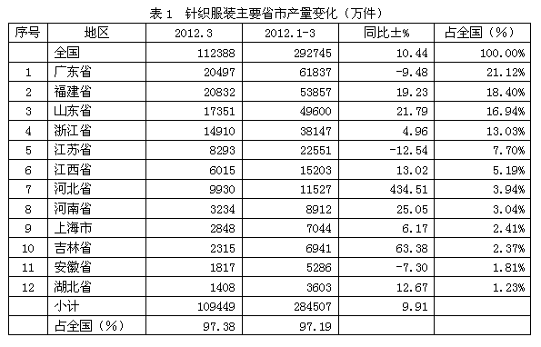 全國針織服裝2012年1-3月份產(chǎn)量合計(jì)為29.27億件,比上年同期增加10.44%;其中產(chǎn)量最大的省市是廣東省,產(chǎn)量為6.18億件,為省市龍頭;其次是福建省,產(chǎn)量5.39億件,位居亞軍;然后是山東省,產(chǎn)量4.96億件,榮立第三;浙江省3.81億件,為第四;江蘇省2.26億件,占第五;江西省1.52億件,位居第六;接下來是河北省1.15億件,為第七;河南省0.89億件,占第八;上海市0.70億件,位居第九;吉林省0.69億件,為第十名;安徽省0.53億件,居第11名;湖北省0.36億件,榮立第12名。上述12大省市2012年1-3月份產(chǎn)量合計(jì)為28.45億件,占全國2012年1-3月份總產(chǎn)量的97.19%。