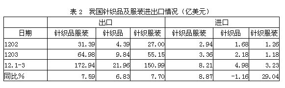 根據(jù)中國海關(guān)的統(tǒng)計(jì)數(shù)據(jù),我國2012年1-3月份針織品及服裝出口總額172.94億美元,同比增加7.59%,占紡織品及服裝出口總額515.68億美元的33.54%;其中1-3月份針織品出口總額21.96億美元,同比增加6.83%,占紡織品出口總額217.66億美元的10.09%;1-3月份針織服裝出口總額150.99億美元,同比增加7.70%,占服裝出口總額298.02億美元的50.66%;