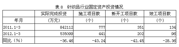 據(jù)國家統(tǒng)計(jì)局公布的數(shù)據(jù),2012年1-3月份針織品行業(yè)實(shí)際完成投資額53.51億元,同比減少36.46%;當(dāng)年以來到目前為止施工項(xiàng)目總數(shù)為441個(gè),同比減少43.24%;其中新開工項(xiàng)目數(shù)202個(gè),同比減少42.45%;截至3月底為止,已實(shí)現(xiàn)竣工項(xiàng)目數(shù)96個(gè),同比減少28.36%,占施工項(xiàng)目總數(shù)的21.77%,表明該行業(yè)投資項(xiàng)目進(jìn)展較好。