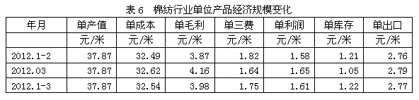 從單位產(chǎn)品經(jīng)濟(jì)規(guī)模變化情況看,2012年1-3月份我國(guó)棉紡織行業(yè)中相對(duì)于每米棉布產(chǎn)量而言,其單產(chǎn)值為37.87元/米,單成本為32.54元/米,單毛利為3.98元/米,單三費(fèi)為1.75元/米,單利潤(rùn)為1.61元/米,單庫(kù)存為1.22元/米,單出口為2.77元/米。由此看來(lái),假如把單產(chǎn)值近似看成每米棉布產(chǎn)量的行業(yè)平均參考價(jià)格,那么其單成本約占85.93%,單毛利約占10.52%,單三費(fèi)約占4.62%,單利潤(rùn)約占4.24%,單庫(kù)存約占3.21%,單出口約占7.32%。