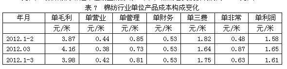 從單位產(chǎn)品成本構(gòu)成變化情況看,2012年1-3月份我國(guó)棉紡織行業(yè)中相對(duì)于每米棉布產(chǎn)量而言,其單毛利為3.98元/米,單營(yíng)業(yè)(單位產(chǎn)品的營(yíng)業(yè)費(fèi)用)為0.42元/米,單管理(單位產(chǎn)品的管理費(fèi)用)為0.81元/米,單財(cái)務(wù)(單位產(chǎn)品的財(cái)務(wù)費(fèi)用)為0.53元/米,單三費(fèi)為1.75元/米,單非常(單位產(chǎn)品的非經(jīng)常性損益)為0.63元/米,單利潤(rùn)(稅前利潤(rùn))為1.61元/米,如果剔除非經(jīng)常性損益的影響,單位產(chǎn)品的名義稅前利潤(rùn)為2.23元/米。