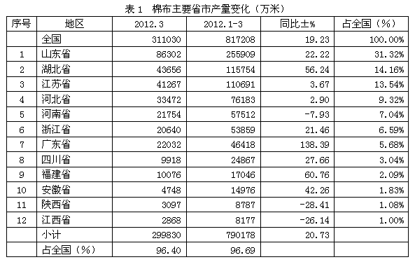 全國(guó)棉布2012年1-3月份產(chǎn)量合計(jì)為81.72億米,比上年同期增加19.23%;其中產(chǎn)量最大的省市是山東省,產(chǎn)量為25.59億米,為省市龍頭;其次是湖北省,產(chǎn)量11.58億米,位居亞軍;然后是江蘇省,產(chǎn)量11.07億米,榮立第三;河北省7.62億米,為第四;河南省5.75億米,占第五;浙江省5.39億米,位居第六;接下來(lái)是廣東省4.64億米,為第七;四川省2.49億米,占第八;福建省1.70億米,位居第九;安徽省1.50億米,為第十名;陜西省0.88億米,居第11名;江西省0.82億米,榮立第12名。上述12大省市2012年1-3月份產(chǎn)量合計(jì)為79.02億米,占全國(guó)2012年1-3月份總產(chǎn)量的96.69%。