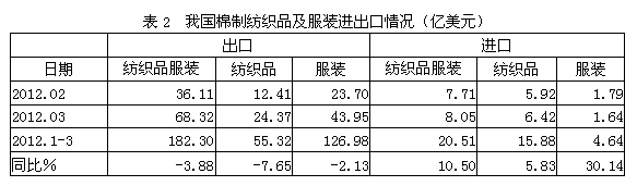 在進(jìn)口方面,我國(guó)2012年1-3月份棉制紡織品及服裝進(jìn)口總額20.51億美元,同比增加10.50%,占紡織品及服裝進(jìn)口總額54.83億美元的37.41%;其中1-3月份棉制紡織品進(jìn)口總額15.88億美元,同比增加5.83%,占紡織品進(jìn)口總額43.68億美元的36.35%;1-3月份棉制服裝進(jìn)口總額4.64億美元,同比增加30.14%,占服裝進(jìn)口總額11.16億美元的41.57%;顯示中國(guó)棉制紡織品和服裝外貿(mào)形勢(shì)較好。