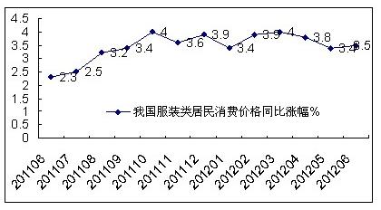 根據(jù)國(guó)家統(tǒng)計(jì)局的數(shù)據(jù),2012年上半年,我國(guó)服裝類商品居民消費(fèi)價(jià)格同比上漲3.7%,其中,5月和6月的同比漲幅相比前幾個(gè)月有所回落,分別為3.4%和3.5%。