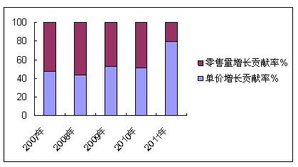 價(jià)格的高漲逐漸成為帶動(dòng)零售額增長(zhǎng)的重要因素,2011年服裝類商品單價(jià)增長(zhǎng)對(duì)零售額增長(zhǎng)的貢獻(xiàn)率高達(dá)79.9%,明顯高于往年水平,相比2010年大幅提高了28.2個(gè)百分點(diǎn),這也就是說,2011年服裝零售額的增長(zhǎng)將近80%是來自于單價(jià)上漲的拉動(dòng)。