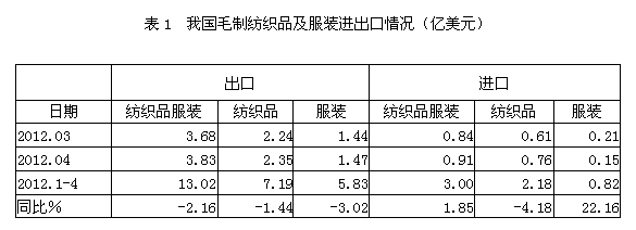 根據(jù)中國海關(guān)的統(tǒng)計數(shù)據(jù),我國2012年1-4月份毛制紡織品及服裝出口總額13.02億美元,同比減少2.16%,占紡織品及服裝出口總額710.03億美元的1.83%;其中1-4月份毛制紡織品出口總額7.19億美元,同比減少1.44%,占紡織品出口總額307.33億美元的2.34%;1-4月份毛制服裝出口總額5.83億美元,同比減少3.02%,占服裝出口總額402.70億美元的1.45%;