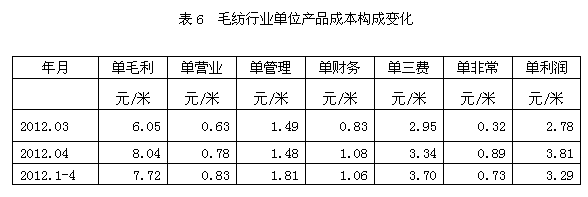 從單位產(chǎn)品成本構(gòu)成變化情況看,2012年1-4月份我國毛紡織行業(yè)中相對于每米呢絨產(chǎn)量而言,其單毛利為7.72元/米,單營業(yè)(單位產(chǎn)品的營業(yè)費(fèi)用)為0.83元/米,單管理(單位產(chǎn)品的管理費(fèi)用)為1.81元/米,單財務(wù)(單位產(chǎn)品的財務(wù)費(fèi)用)為1.06元/米,單三費(fèi)為3.70元/米,單非常(單位產(chǎn)品的非經(jīng)常性損益)為0.73元/米,單利潤(稅前利潤)為3.29元/米,如果剔除非經(jīng)常性損益的影響,單位產(chǎn)品的名義稅前利潤為4.02元/米。