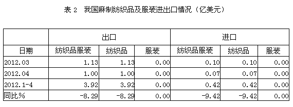 在進(jìn)口方面,我國(guó)2012年1-4月份麻制紡織品及服裝進(jìn)口總額0.42億美元,同比減少9.42%,占紡織品及服裝進(jìn)口總額74.21億美元的0.57%;其中1-4月份麻制紡織品進(jìn)口總額0.42億美元,同比減少9.42%,占紡織品進(jìn)口總額60.22億美元的0.70%;顯示中國(guó)麻制紡織品和服裝外貿(mào)形勢(shì)較好。