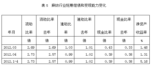 麻紡織行業(yè)資產(chǎn)負(fù)債率2012年1-4月份為49.68%,表明財(cái)務(wù)政策的運(yùn)作比較穩(wěn)??;凈資產(chǎn)收益率為5.16%,表明該行業(yè)凈資產(chǎn)運(yùn)作效率較高。