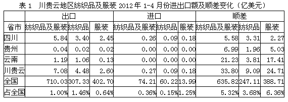 我國川貴云三省2012年1-4月份紡織品及服裝出口額為7.08億美元,占全國紡織品服裝出口總額的1.00%,其中紡織品出口額為4.48億美元,占全國1.46%,服裝出口額為2.60億美元,占全國0.64%;在進(jìn)口方面,川貴云三省紡織品及服裝進(jìn)口額為0.27億美元,占全國紡織品服裝進(jìn)口總額的0.36%,其中紡織品進(jìn)口額為0.09億美元,占全國0.15%,服裝進(jìn)口額為0.18億美元,占全國1.25%;顯示我國川貴云地區(qū)紡織品服裝出口總額遠(yuǎn)高于進(jìn)口總額,順差明顯,表明該地區(qū)紡織品服裝在國際市場(chǎng)上競(jìng)爭力較強(qiáng)。