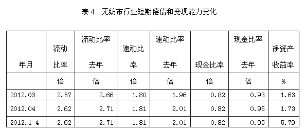 從短期償債和變現(xiàn)能力的變化看,無紡布行業(yè)流動(dòng)比率(流動(dòng)資產(chǎn)/流動(dòng)負(fù)債)2012年1-4月份為2.62倍,而上年同期為2.71倍,流動(dòng)比率較高,表明企業(yè)短期償債能力較強(qiáng);