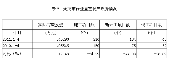 據(jù)國家統(tǒng)計(jì)局公布的數(shù)據(jù),2012年1-4月份無紡布行業(yè)實(shí)際完成投資額40.56億元,同比增加17.48%;當(dāng)年以來到目前為止施工項(xiàng)目總數(shù)為159個(gè),同比減少24.29%;其中新開工項(xiàng)目數(shù)75個(gè),同比減少44.03%;截至4月底為止,已實(shí)現(xiàn)竣工項(xiàng)目數(shù)32個(gè),同比減少28.89%,占施工項(xiàng)目總數(shù)的20.13%,表明該行業(yè)投資項(xiàng)目進(jìn)展較好。