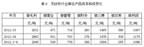 從單位產(chǎn)品成本構(gòu)成變化情況看,2012年1-4月份我國無紡布行業(yè)中相對(duì)于每噸無紡布產(chǎn)量而言,其單毛利為2945元/噸,單營業(yè)(單位產(chǎn)品的營業(yè)費(fèi)用)為526元/噸,單管理(單位產(chǎn)品的管理費(fèi)用)為779元/噸,單財(cái)務(wù)(單位產(chǎn)品的財(cái)務(wù)費(fèi)用)為289元/噸,單三費(fèi)為1594元/噸,單非常(單位產(chǎn)品的非經(jīng)常性損益)為255元/噸,單利潤(rùn)(稅前利潤(rùn))為1096元/噸,如果剔除非經(jīng)常性損益的影響,單位產(chǎn)品的名義稅前利潤(rùn)為1351元/噸。