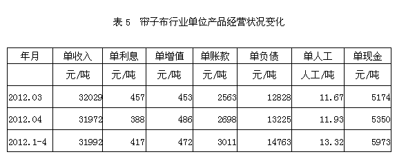 從單位產(chǎn)品經(jīng)營(yíng)狀況變化情況看,2012年1-4月份我國(guó)簾子布行業(yè)中相對(duì)于每噸簾子布產(chǎn)量而言,其單收入(單位產(chǎn)品的主營(yíng)收入)為31992元/噸,單利息(單位產(chǎn)品的利息支出)為417元/噸,單增值(單位產(chǎn)品的增值稅支出)為472元/噸,單賬款(單位產(chǎn)品的應(yīng)收帳款)為3011元/噸,單負(fù)債(單位產(chǎn)品的負(fù)債)為14763元/噸,單人工(單位產(chǎn)品的人工消耗)為13.32人工/噸(表示每人每天生產(chǎn)簾子布產(chǎn)量0.075噸/人工),單現(xiàn)金(單位產(chǎn)品的現(xiàn)金流)為5973元/噸。